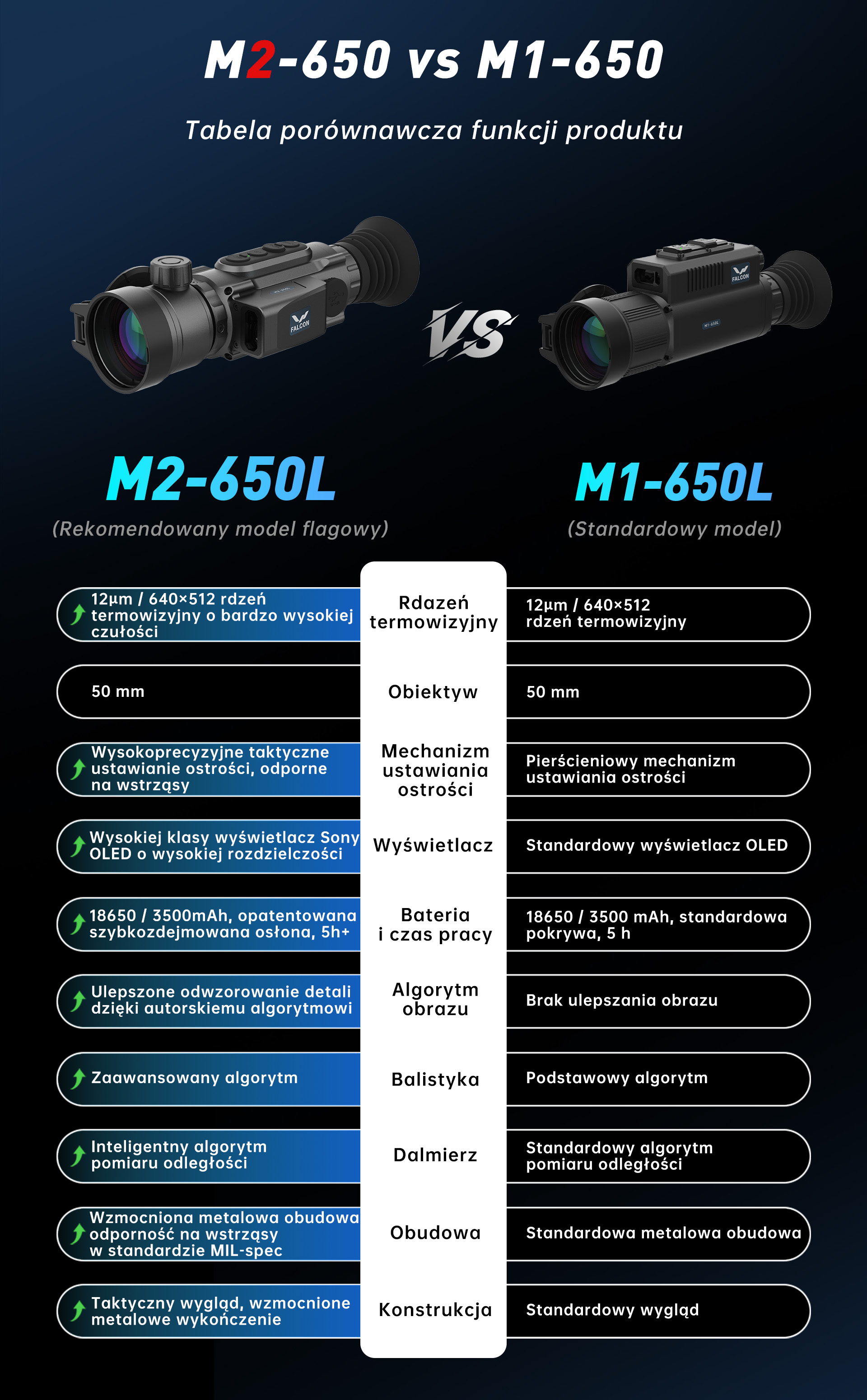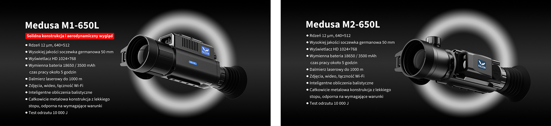 Porównanie celowników termowizyjnych FALCON MEDUSA M1-650L i M2-650L (informacje techniczne i produktowe):