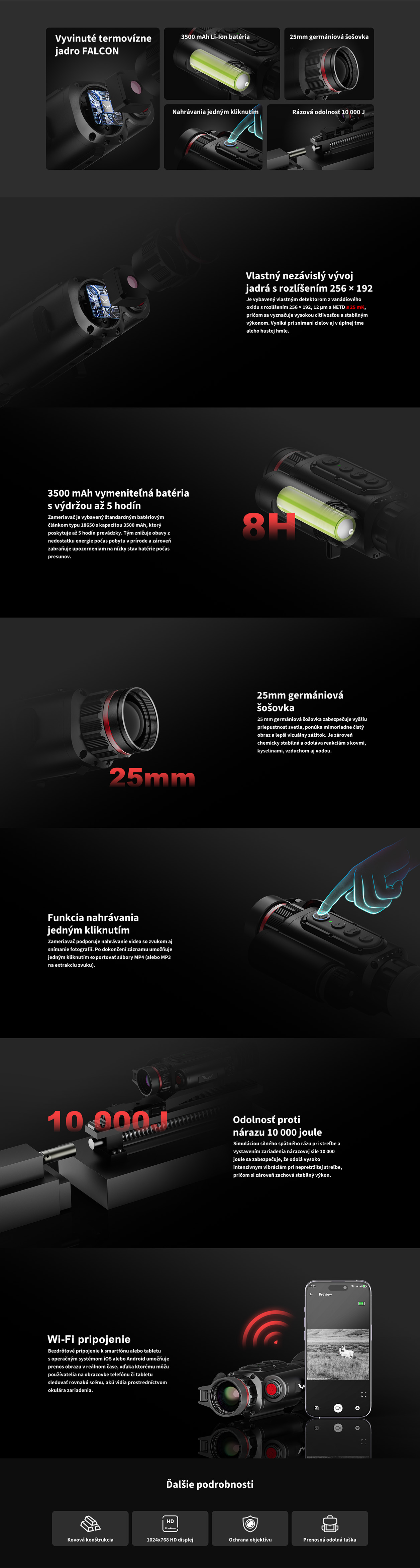 S odolnosťou IP67 zvládne FALCON MEDUSA dážď, sneh aj prašné prostredie. Je ideálny pre nočný lov, pozorovanie zveri aj taktické nasadenia. Režim spánku šetrí energiu, takže máte istotu, že zariadenie vydrží aj pri dlhšom pobyte v teréne.